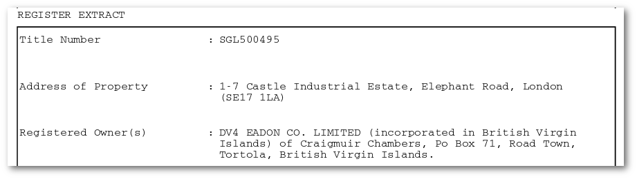 The entire Elephant One site including the market square land given to Delancey by the Council, is now registered to a Delancey shell company in the British Virgin Islands.